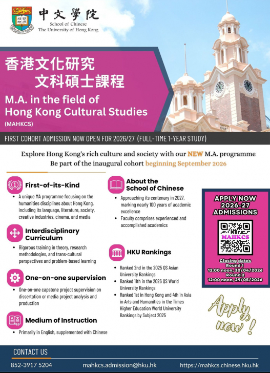 Master of Arts in the field of Hong Kong Cultural Studies ul > li#banner_04 > a > img | hku.hk/f/banner/28942/258c90/mahkcs-hku-banner-350x123px.gif |