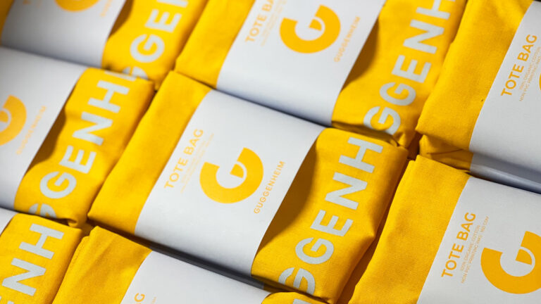 Bright yellow tote bags with the Guggenheim name are folded, bound with white p… div > a > picture.aspect-container > img.aspect-image | /wp-content/uploads/2024/11/gen-retail-guggenheim-logo-to... |