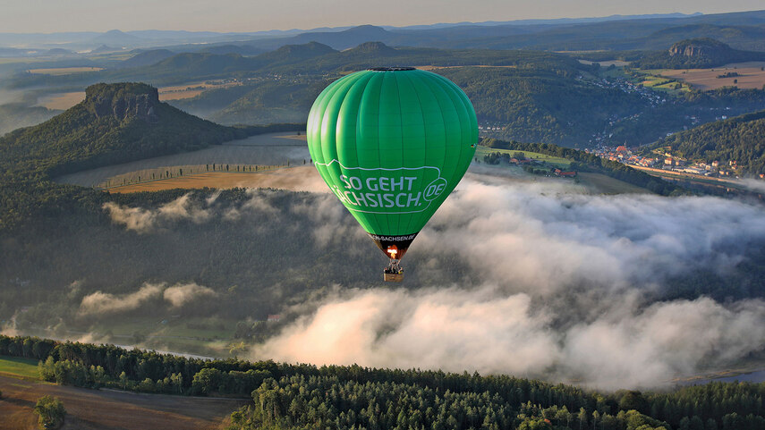 Ein grüner Heißluftballon fährt vor der Kulisse der Sächsischen Schweiz. article#highlight-slide-6341 > div.rsSlideContent > div.rsImage > img.media-object | www.sachsen.de/img/SGS_Teaser_rdax_855x481_87s.jpg |